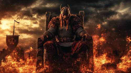 In a Viking Age setting, a powerful berserker stands tall, adorned in royal armor and a crown of iron and bone, exuding both ferocity and kingly authority. The background features a throne made of ancient stone, surrounded by flames and Nordic symbols, with the silhouette of a Viking longship in the distance under a stormy sky Hyper Realistic HD photos --v 6.1 --ar 16:9
