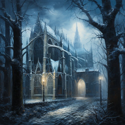 A gothic cathedral dedicated to the goddess of virtue at night in the middle of winter, oil painting