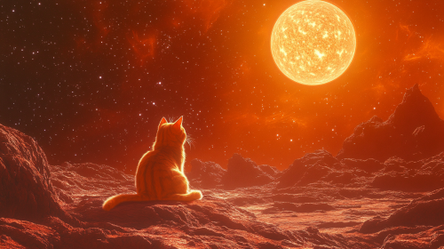 2d art, retro postcard style, painted art, masterpiece, Moebius art style, a cat pillow placed in the center of the frame on the surface of an uknown planet, outer space is visible in the background, orange colors --aspect 16:9