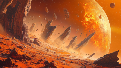 2d art, painted art, masterpiece, Moebius art style, surface of an uknown planet covered in orange stone, dust, rocks, cliffs, outer space is visible in the background --aspect 16:9