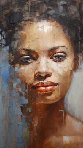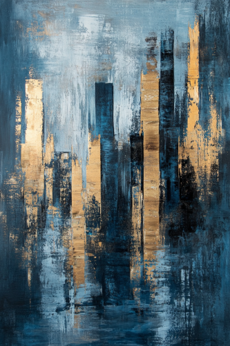 Design a modern abstract painting that captures the reflection of a city skyline, using deep blues, greys, and hints of metallic gold. The composition should feature vertical shapes that resemble skyscrapers, blurred with soft edges and reflections. Create a feeling of calm within the urban chaos, with smooth transitions and subtle textures to evoke the serenity of a city at night --ar 2:3