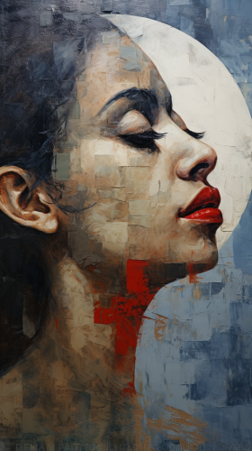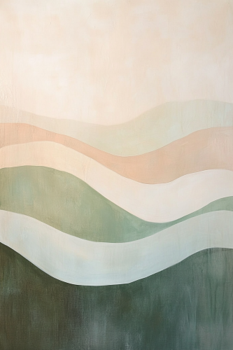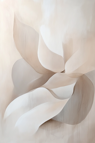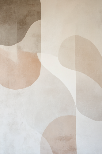 Generate an abstract canvas that features layered, transparent shapes that softly overlap. The palette should include muted tones of light beige, stone grey, and warm ivory. The layers should create a gentle depth, with each shape blending into the next to create a smooth and cohesive composition. Use subtle textures to add dimension without overwhelming the minimal aesthetic. The overall mood should be tranquil, evoking a sense of peace and spaciousness. --ar 2:3