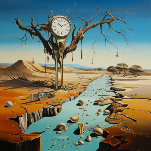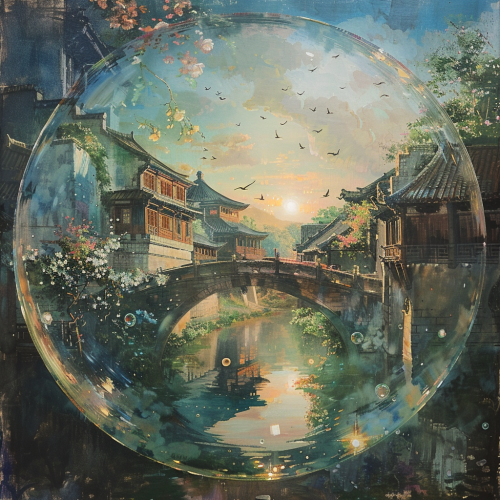 Bubble floating at the top left, palace of the Tang Dynasty inside the bubble. Outside the bubble a decayed street with some old houses, setting sunlight over an old bridge with small flowers beside,some small swallows flying over the bridge. painted by goya.— ar 32:21 --v 6.0
