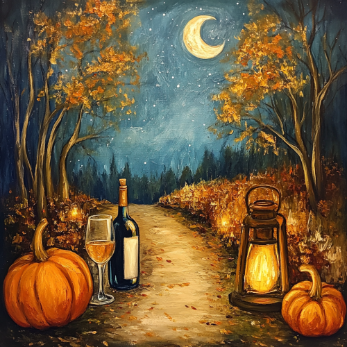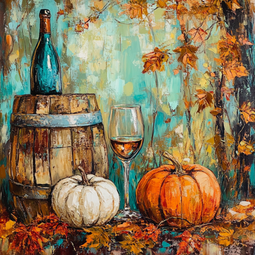 cozy fall painting featuring pumpkins, wine glass, wine bottle, wine barrel, fall palette colors, teal, orange, and white pumpkins, leaves, forest setting