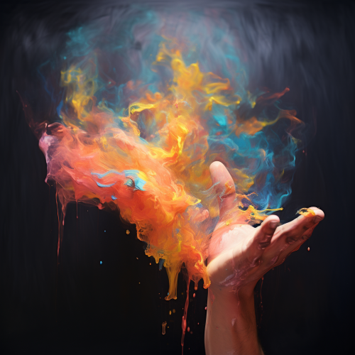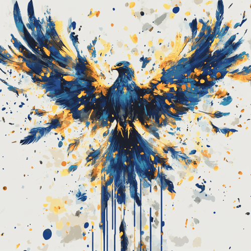 A majestic and graceful design of a large bird, like an eagle or phoenix, with feathers gently falling around it. The bird should have a powerful yet elegant presence, with detailed wings spread wide. Incorporate a spilled paint aesthetic with vibrant colors like blue, gold, and white, with splashes and drips that merge into the feathers and background. The falling feathers should appear to dissolve into paint splatters as they descend, adding a dynamic and artistic touch. The overall design should be visually striking, modern, and optimized for DTG printing, evoking a sense of freedom and majesty.