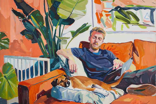 matisse style painting of a 40 year old man, with short blond hair and a reddish-blond beard, whitening at the chin, sitting on a couch in a nice house, with an infant in a bassinet next to him. He has a navy blue macbook in his lap and a curled-up airedale terrier lying next to him on the couch. --v 6.0 --ar 3:2