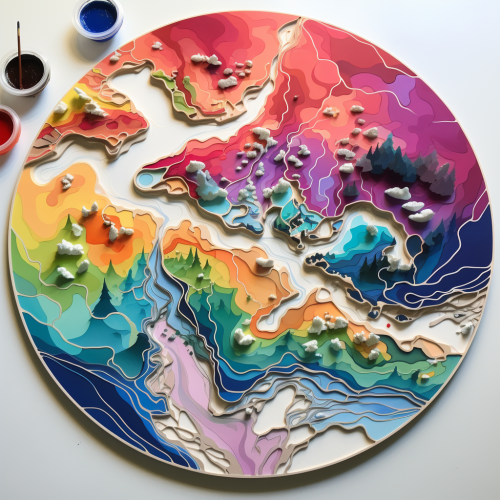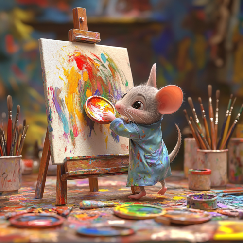 mouse artist painting on an easel, wearing a smock and holding a palette. The mouse is adding vibrant colors to a canvas, with art supplies and a creative studio environment, in a cute and artistic scene. HDR, 4k