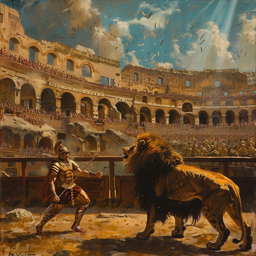 An oil painting of a venatione in the Roman Coliseum, featuring a majestic lion and a Roman hunter engaging in a graceful standoff in the arena. The crowd watches with excitement from the stands. Warm colors, detailed Roman architecture, harmonious action, naturalistic lighting --ar 1:1 --v 6.0