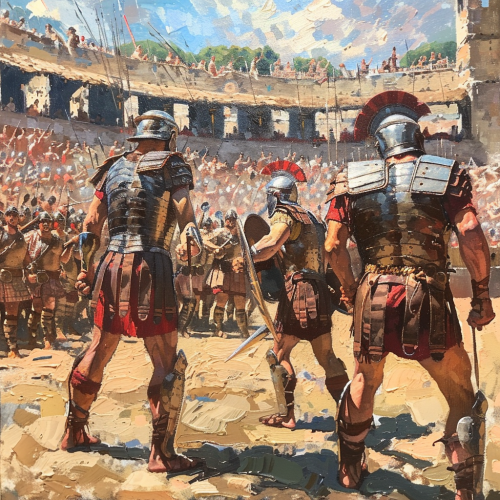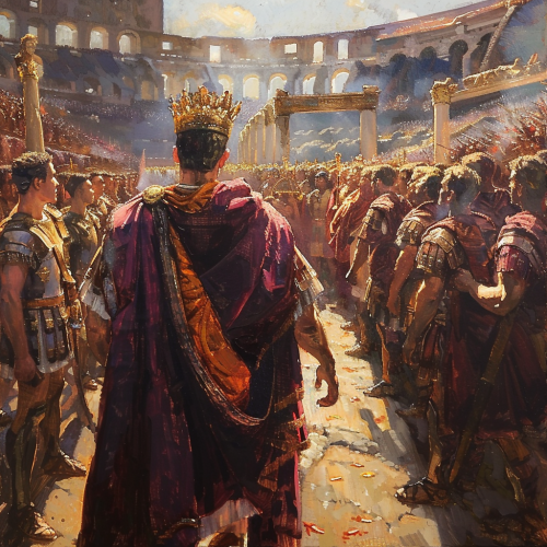 An oil painting of the Roman emperor entering the Coliseum, his golden laurel crown glinting in the sunlight, greeted by the cheering crowd. The emperor in regal purple, soldiers flanking him, grand and majestic scene. Warm sunlight, rich details, royal atmosphere --ar 1:1 --v 6.0