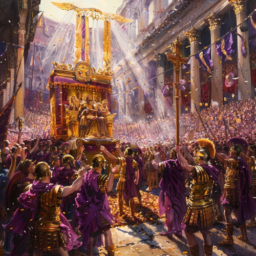 An oil painting of the emperor's grand entrance into the Roman Coliseum, where the crowd rises to cheer. The emperor is elevated on a golden throne, flanked by senators. Rich purples and golds, detailed Roman armor, bright sunlight illuminating the scene --ar 1:1 --v 6.0