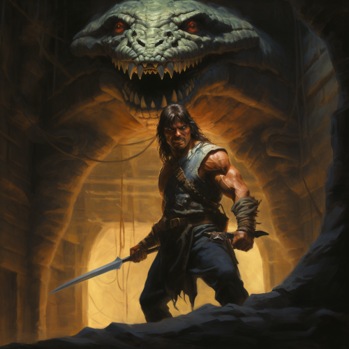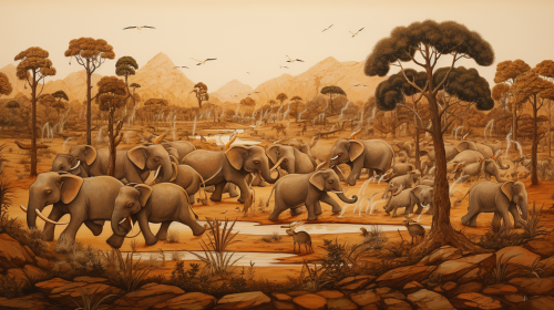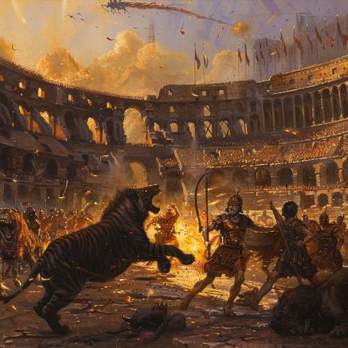 An oil painting of a venatione in the Roman Coliseum, exotic animals like lions, tigers, and elephants battling Roman hunters in the arena. Wild landscape, golden light, vivid action, tense atmosphere, richly detailed animals and weapons --ar 1:1 --v 6.0