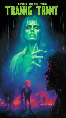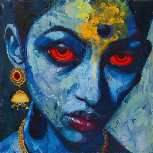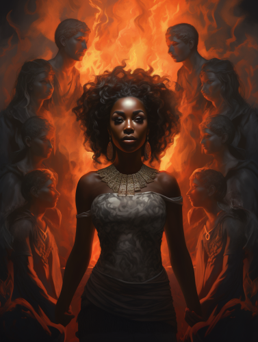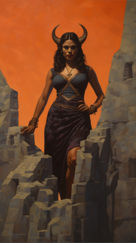 1970's dark fantasy book cover paper art dungeons and dragons style oil on linen painting of Karlach Cliffgate the female tiefling from the Forgotten Realms and Baldurs Gate 3 video games with minimalist far perspective --ar 9:16