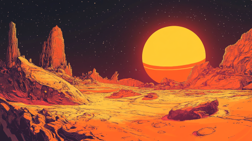 2d art, retro postcard style, painted art, masterpiece, Moebius art style, surface of an uknown planet, outer space is visible in the background, orange colors --aspect 16:9