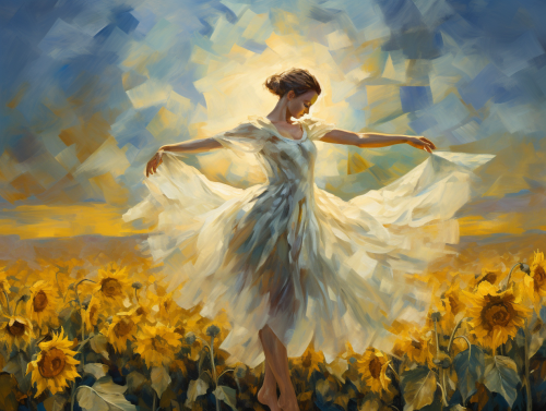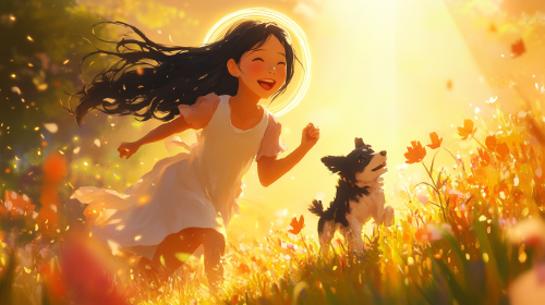 A young Korean girl, appearing as a serene bodhisattva with a glowing halo around her head, playing joyfully with a small dog in a sunlit field. Her long black hair flows behind her as she runs, laughter evident in her expression. The scene is vibrant and lively, yet filled with a sense of calm and peace. The background features soft grass and wildflowers, painted in an oil painting style with warm colors and gentle brush strokes, capturing a healing and harmonious atmosphere. --ar 16:9