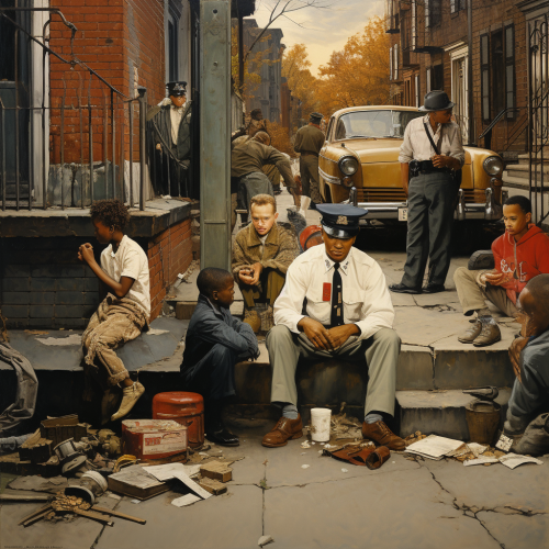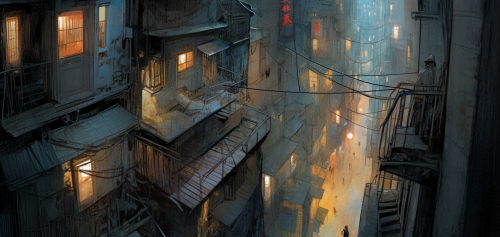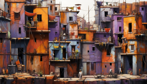 slum in Italian town, orange and purple, hyeronimous bosch style, --ar 7:4