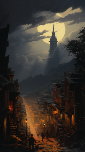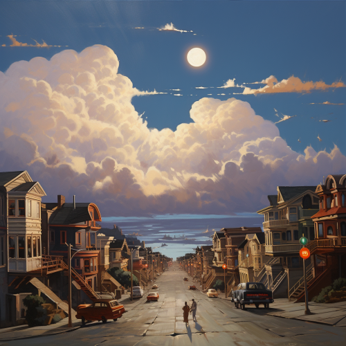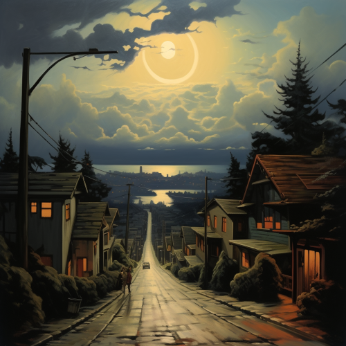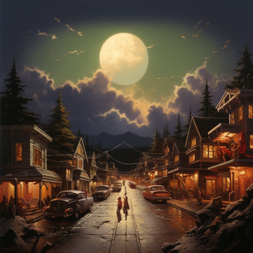 70th american town streets, twin peaks, cloudy sky, moon, painted by frank frazetta, oil painting, --ar 9:16