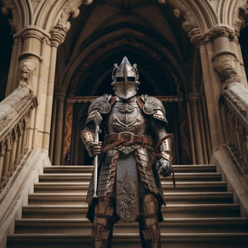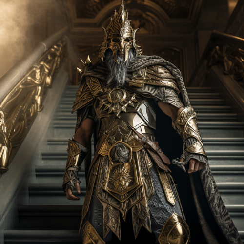 picture of an ancient warrior who is wearing armor that combines the style of 1400s european and 1100s vikings, inspired by imagery of Odin, wearing a valkyrie helmet. He is standing at the top of the outdoor stairs of a great cathedral with the entry door to his back, at the foot of the stairs you see men and women gathered around and cheering as though they have renewed hope. Bright pale light, hopeful colors. high detail, painting, frank frazetta