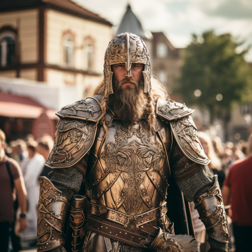 picture of an ancient warrior who is wearing armor that combines the style of 1400s european and 1100s vikings, inspired by imagery of Odin, wearing a valkyrie helmet. The warrior is stoic looking, cast in light, holding aloft a sword, his cape flows in the wind. He is standing in a town square as if addressing the people of a city. Behind him you can see men and women cheering as though they have renewed hope. Bright pale light, hopeful colors. high detail, painting, frank frazetta