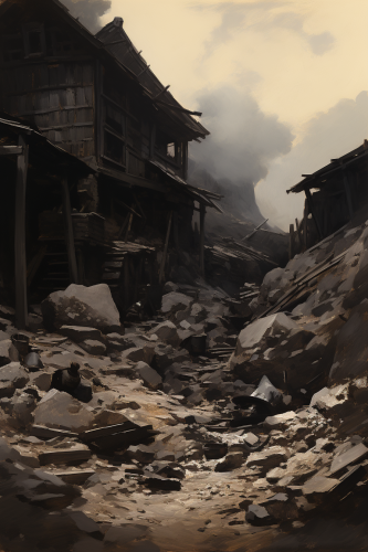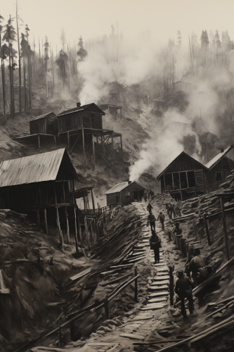 1890s gold mine, low detail painting, in the style of Anselmo Ballester, visible strokes from painting brush, gray duotone,– iw (1.9) --v 5.2 --ar 2:3