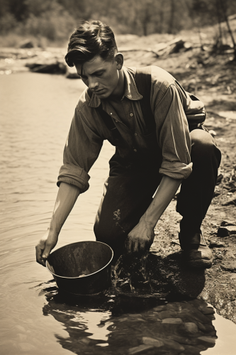 gold panning, in the style of Anselmo Ballester, visible strokes from painting brush, duotone, 1959 – iw (1.9) --v 5.2 --ar 2:3