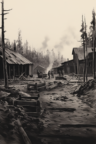 1890s logging camp, high angle, in the style of Anselmo Ballester, visible strokes from painting brush, gray and duotone, 1959 – iw (1.9) --v 5.2 --ar 2:3