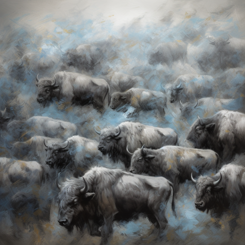 hundreds of bison, running, high angle, stampede, in the style of Anselmo Ballester, visible strokes from painting brush, gray and blue --v 5.0