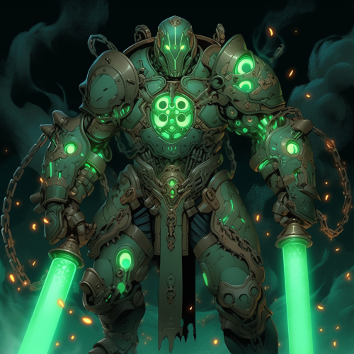 Grimdark aetherpunk amazing enhanced warforged artificer champion, full body, anime style, artificer bodysuit, enhanced equipment, high fantasy, digital art, masterpiece painting, ultra detailed, ultra high definition, 8K resolution, 3D shading, superior quality, cover illustration, complex design, luminous highlights, rich vibrant colours, hyperrealistic, meticulously hyper detailed, high contrast, artstation --niji 5