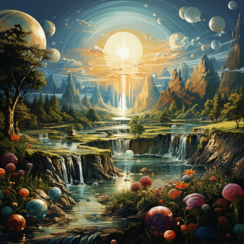 planets viewed from a flowery meadow, waterfall in the background, in the style of Cezanne, highly detailed --s 250