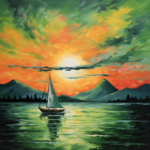 sailboat in an ocean bay ,green sky with sunset, mountains in background, Monet painting style --s 50