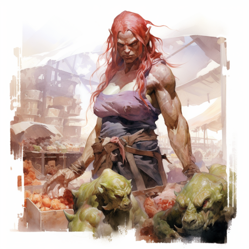 an impressionistic watercolor painting on a white background. A motherly red-skinned orc woman wearing peseant rags. Thin and feminine body. Visible muscles. Ragged clothing. Peseant standing in a market. Fantasy character. Orc.
