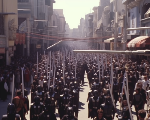 thousands of jedis with lightsabers marching on the streets of Gaza with banners supporting palestine, as shot on Panavision Panaflex Gold II, CAMÉRA FILM 35 MM, maximalism, --ar 5:4 --s 750 --v 5.1