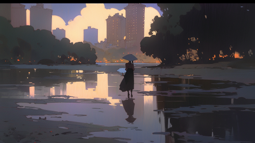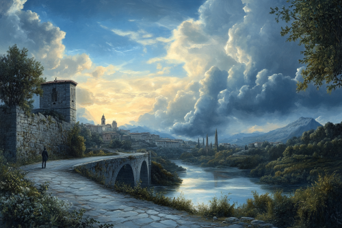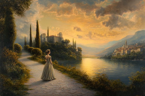 an Hyperrealist painting by Jules Dupré and Bouguereau depicting an elegant lonely woman wearing glamour dress on the foreground walking on a textured road along a river from the bottom left flowing towards an italian renaissance city and sunrise on the top right. Beautiful tormended sky with clouds in the style of Turner. --ar 3:2