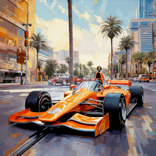 a 2023 f1 car in las vegas background, in the style of philip pearlstein, raimonds staprans, glen keane, hyperrealistic paintings, flowing lines