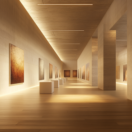 cinematographic image of a modern art gallery, at a different angle, with lights, paintings of different sizes, with divisions between the paintings--ar 16:9