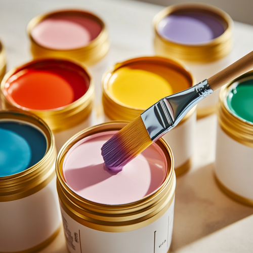 Una serie di secchi di vernice premium su uno scaffale a più piani in un ambiente ben illuminato, con un pennello immerso nella vernice, pronto per l’uso.