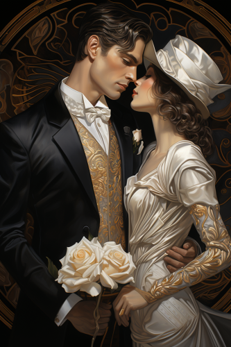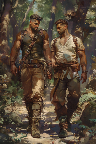blending the painting styles of frank frazetta and j. c. leyendecker, two men walking in the forest, holding hands, romantically, strong, viral, muscular, cute, very handsome --v 6.0 --ar 2:3