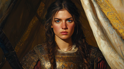 Alexandre Cabanel's painting depicting scythian warrior queen Tomris in her tent, athletic caucasian woman with long brown hair and blue eyes, scythian armor, serious face, nomad tent interior in the background --v 6.1 --style raw --ar 16:9 --q 2