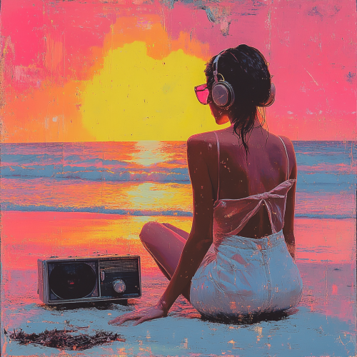 painting, glitching pastel neon, a woman sitting on the beach, by her a radio and she’s wearing an old headphone, motif from 1950s, VHS glitching --s 750 --v 6.1 --style raw