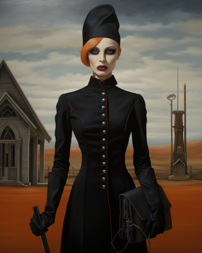 American Gothic, street fashion by Grant Wood takes on visual kei aesthetics ::10 , fusing the iconic painting with bold colors and theatrical fashion ::5 , presenting a dramatic reinterpretation ::3 , Mime, Putple river --ar 4:5 --v 5.2
