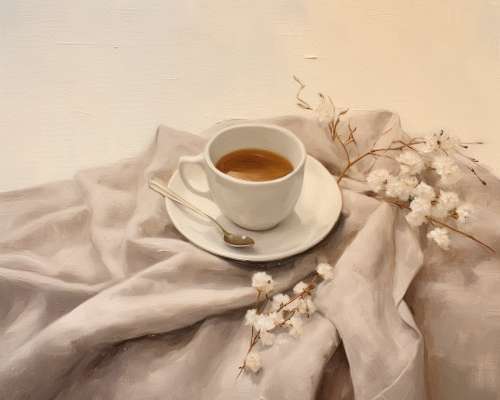 antique oil painting, Hot chocolate in the center of the canvas, minimal winter still life, country aesthetic, moody neutral colors, close up, Cottagecore --ar 5:4
