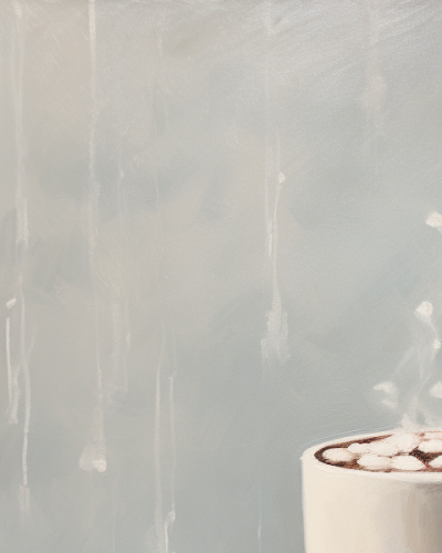 antique oil painting, Hot chocolate by winter window, minimal winter still life, country aesthetic, moody neutral colors, close up --ar 4:5