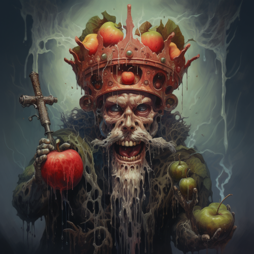 A apple like cave demon, holding a shotgun, Crown on his head, dripping art