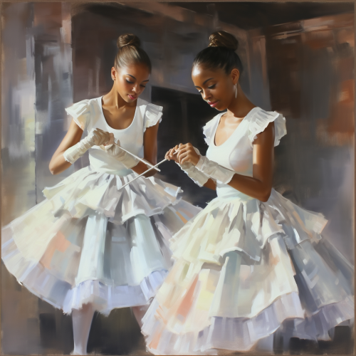 two 14 year old ballerinas dressed in all white and soft pastel tutu skirts and flat ballerina slippers. each doing a different dance move. Natural hair and features. Painted in watercolor oil painting style inside a large dance studio with natural light. High quality. Soft pastels. Realistic fingers and feet. elegant movements --s 750