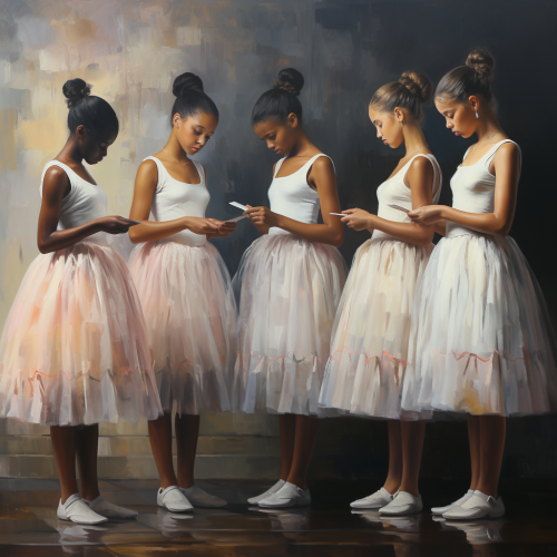 5 ballerinas age 15 dressed in full fluffy white and soft pastels tutus skirts and flat ballerina slippers. some face showing, some profile stance, some twirling. Natural hair and features. Painted in heavy oil painting style of Degas, inside a large old fashioned natural light dance studio. High quality. Soft pastels --s 750