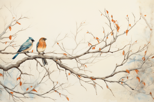 painting of a simple set of tree branches, up close, with many blue and orange sparrows and leaves visible. Muted, neutral colours, messy cream background --ar 3:2