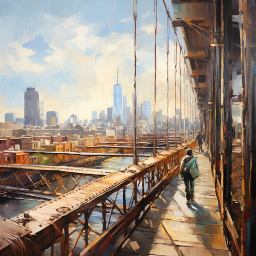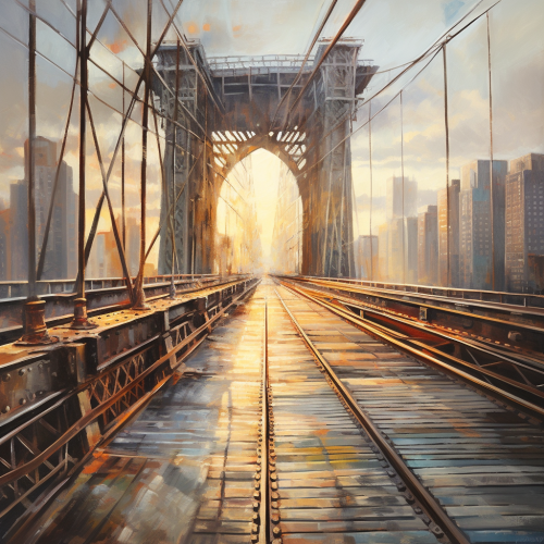 painting, looking over the rail of the brooklyn bridge. Style is thick oil paint in light colors.