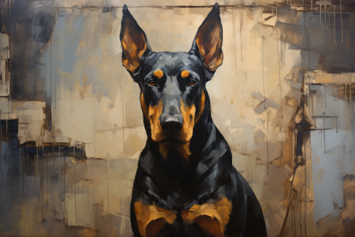 Geometry, thick impasto, oil painting of a brown and black doberman pinscher, iconic, wide area, depth of field, clean light background, pareidolia photography, Greg Manchess, ::1 by piet Mondrian :wundervoll:0, --ar 3:2 --v 5.2 --s 250