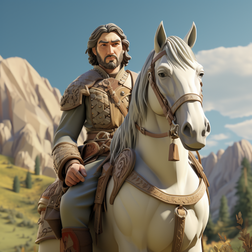 a pleasant and charismatic inhabitant of the Caucasus of the 13th century, a beautiful picture in which Hein in a national Caucasian outfit strokes a horse with his hand, a simple avatar, 3d rendering, cartoon, popmart, hyperrealistic style, --s 250