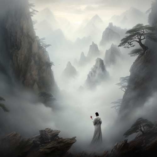 Ethereal Chinese mountains shrouded in fog, a solitary figure with a wine cup, capturing the essence of Li Bai's 将进酒, digital oil painting