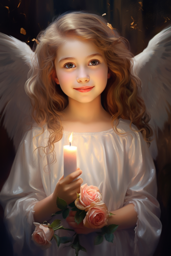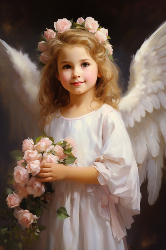 oil painting, Cute little girl angel with beautiful wings, smiles and looks straight ahead, dreamy scene, little angel wears a glowing rose wreath on her head, holds a rose flower in her hand , divine Light, 3d icon, blender 3d, disney --ar 10:15